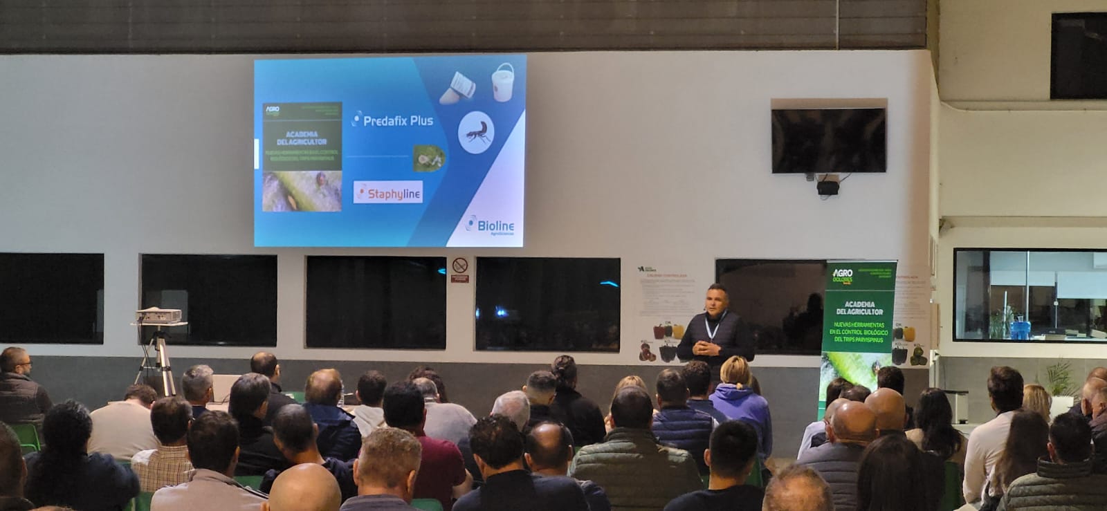 Nuestro proveedor de insectos auxiliares nos mostró las últimas novedades para el control de trips Parvispinus en el cultivo de pimiento. Manolo Gomez Romero, jefe de desarrollo de Bioline, presentó PREDAFIX PLUS, pulverizable sobre el cultivo y que alimenta a los ácaros depredadores para mejorar su establecimiento. Además, nos mostró también Atheta Coriara, un escarabajo depredador de trips en suelo. Ambas novedades están ya disponibles en nuestras instalaciones de Agroservicios Los Triviños.
