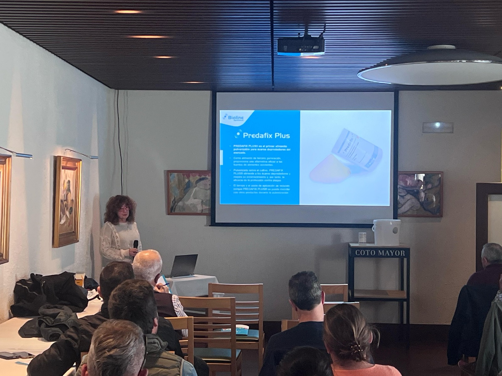 Jornada presentada por Mercedes Lorca (delegada del campo de Cartagena) donde se expuso a los técnicos Predafix Plus, alimento pulverizable sobre el cultivo para un mejor establecimiento de los acaros depredadores, y Staphyline, formulado a base de Atheta coriara, depredador de larvas de trips en suelo.